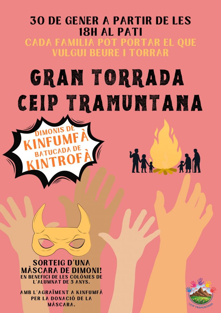 El pròxim 30 de gener a partir de les 18 h, ens trobarem al pati del CEIP Tramuntana per gaudir plegats d’una gran torrada en famÃlia.