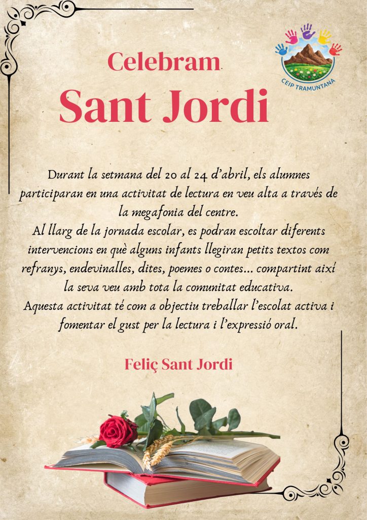 A CEIP Tramuntana ja estam preparats per viure una de les setmanes més especials del curs. Amb motiu de Sant Jordi, del 20 al 24 d’abril, hem organitzat una proposta que vol omplir l’escola de paraules, veus i emocions.