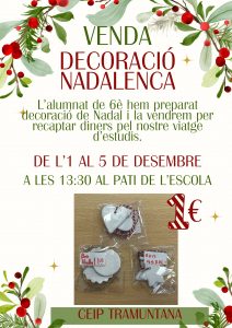 L’alumnat de 6è de Primària ha iniciat diverses activitats per recaptar fons per al viatge d’estudis.La primera és la venda de productes de Nadal, i podeu consultar el catàleg adjunt.